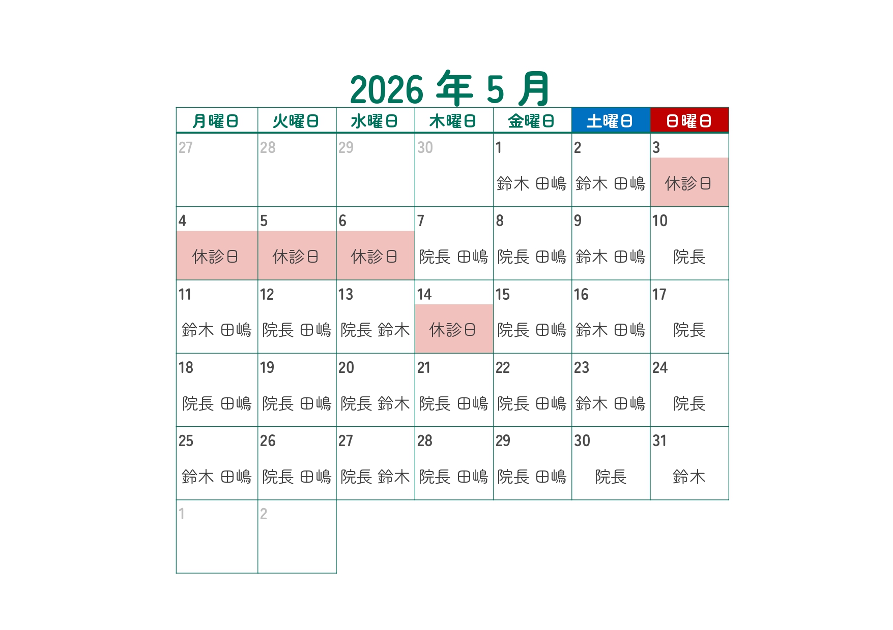※3日(日)~6日(水)、14日(木)は休診日となっております。ご不便をおかけいたしますが、何卒宜しくお願いいたします。